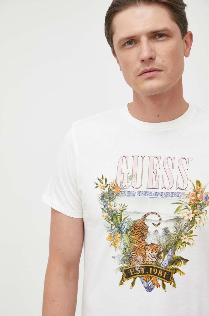 Бавовняна футболка Guess колір бежевий з принтом (3317009)