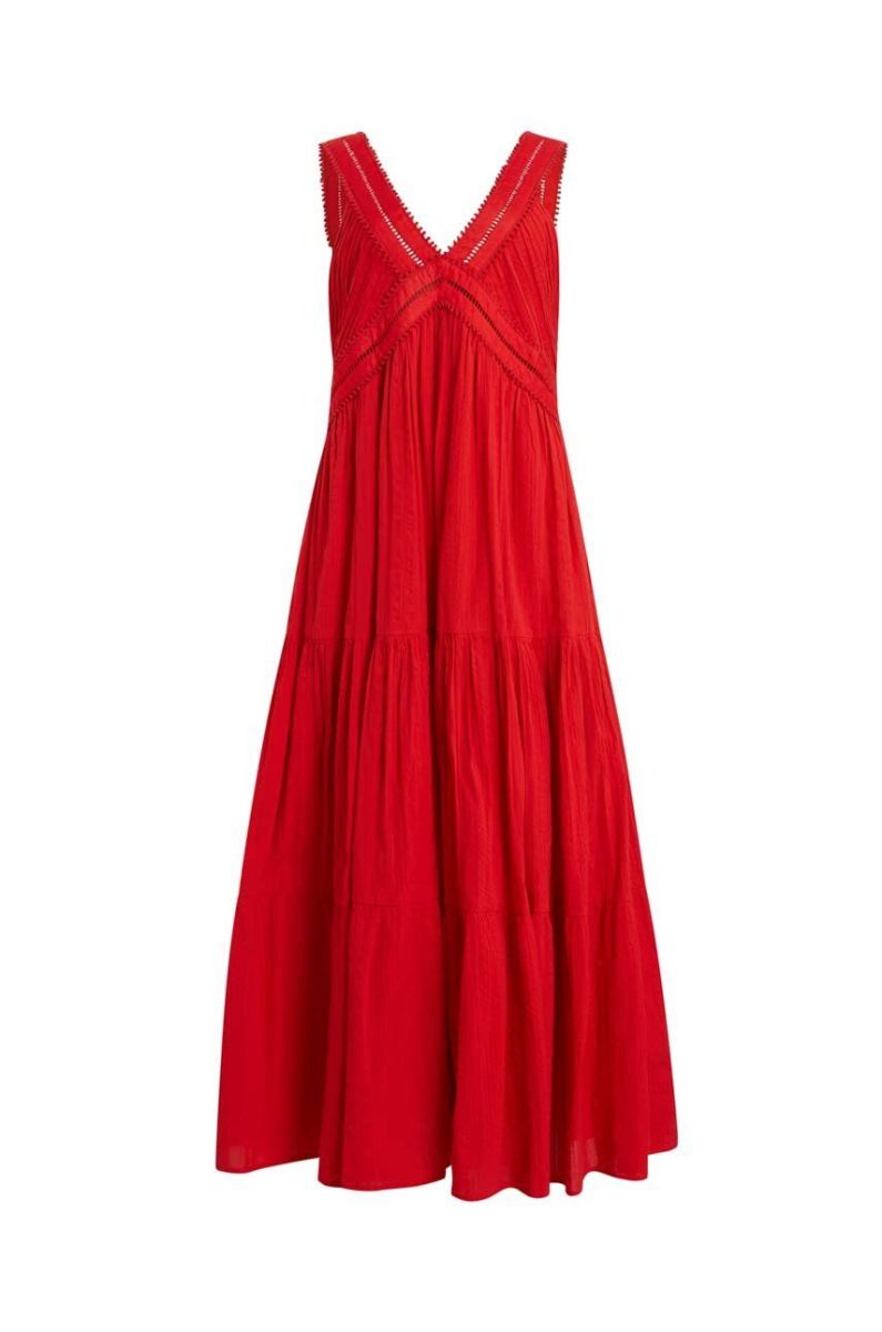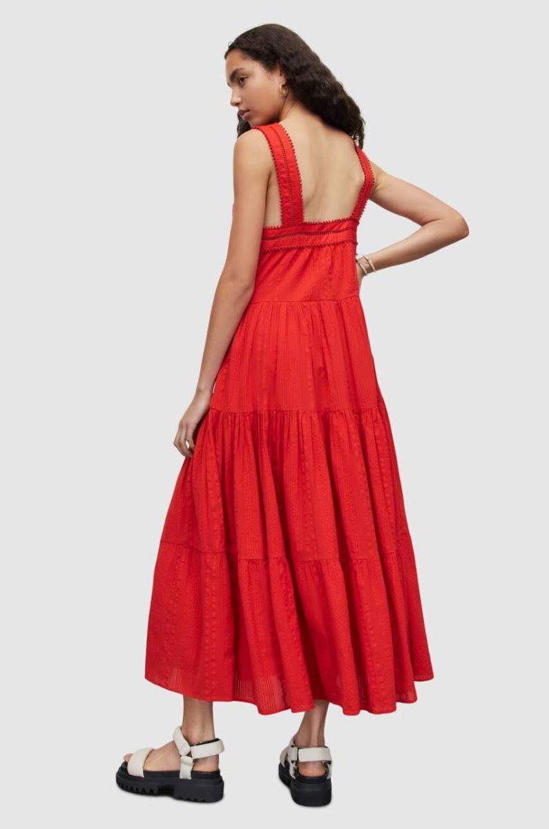 Бавовняна сукня AllSaints колір червоний maxi розкльошена