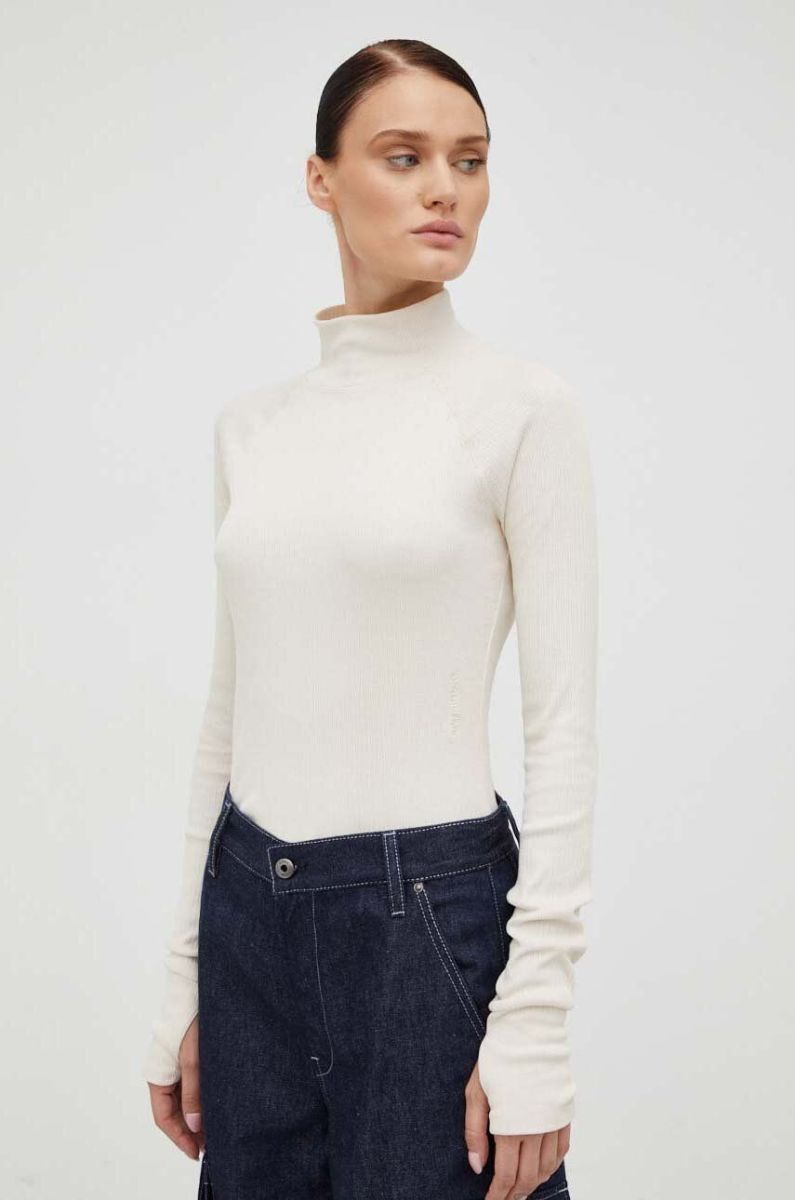 Бавовняний лонгслів G-Star Raw колір бежевий півгольф