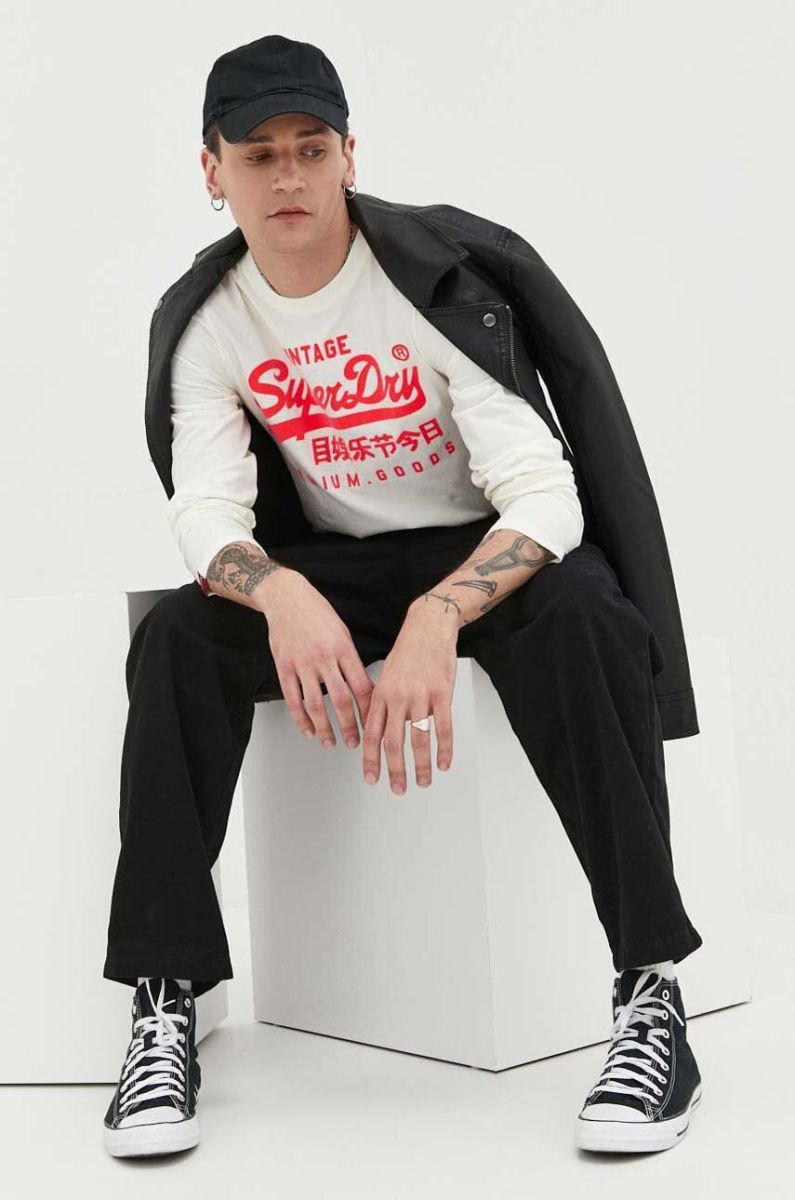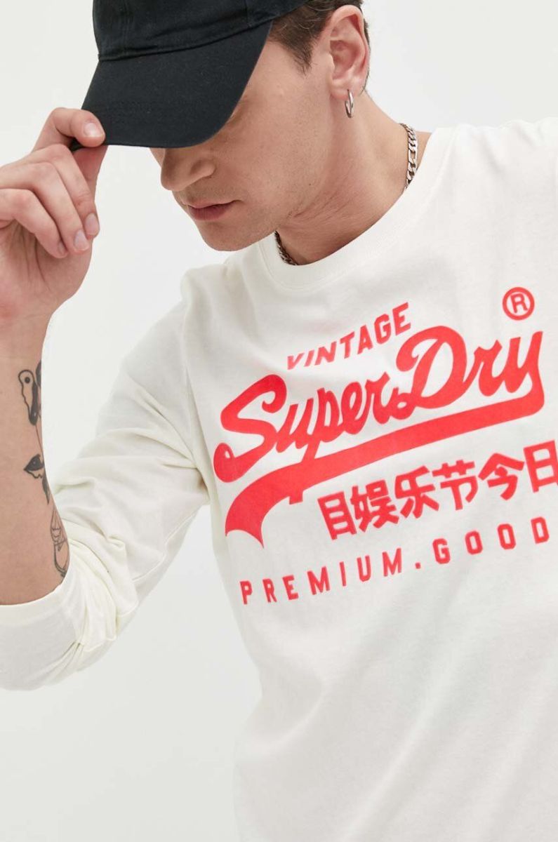 Бавовняний лонгслів Superdry колір бежевий з принтом