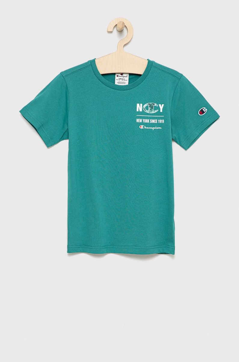 Дитяча бавовняна футболка Champion 305991 колір зелений з принтом