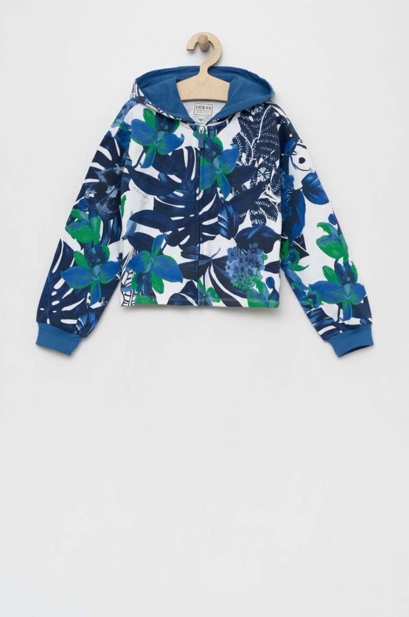 Дитяча кофта з капюшоном із колекції Guess. Модель із застібкою на блискавку виготовлена із еластичного трикотажу. Надзвичайно комфортний матеріал, виготовлений з натуральних волокон.