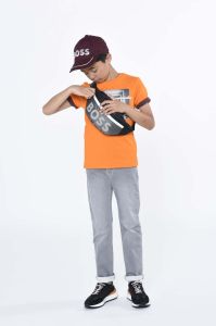 Дитяча бавовняна шапка BOSS колір синій з аплікацією