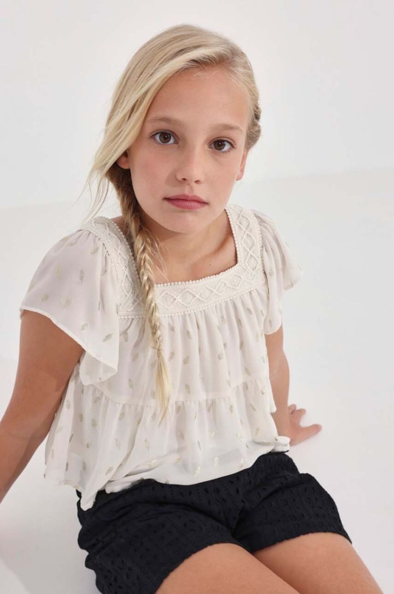 Дитяча блузка із колекції Mayoral. Модель виготовлена із тканини. Має виріз фасону каро.