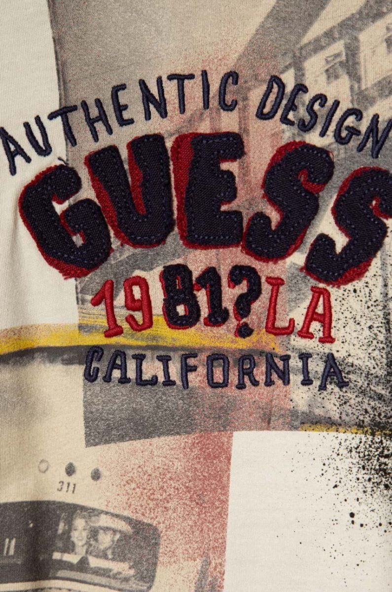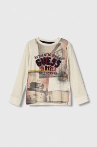 Дитячий бавовняний лонгслів Guess колір бежевий візерунок