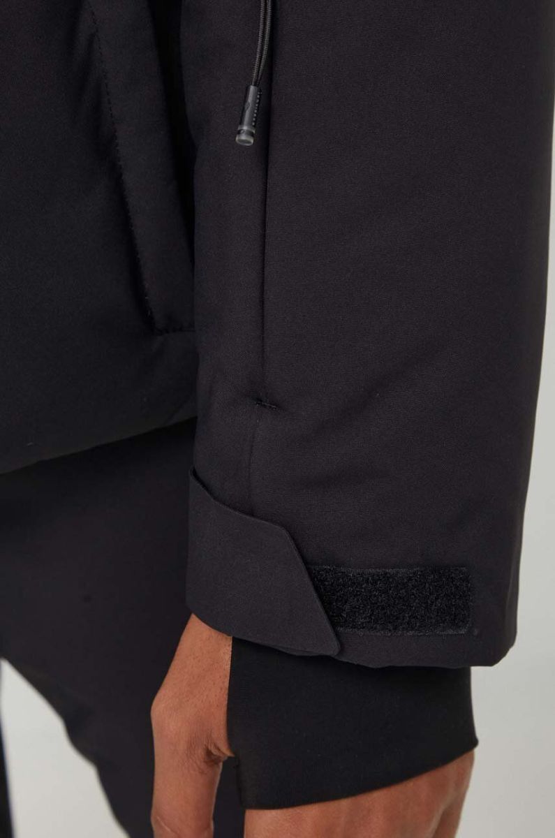 - Нижній край оброблений ремінцями зі стопорами, які завдяки можливості регулювання окружності нижньої частини куртки, збільшують ізоляцію від холоду.