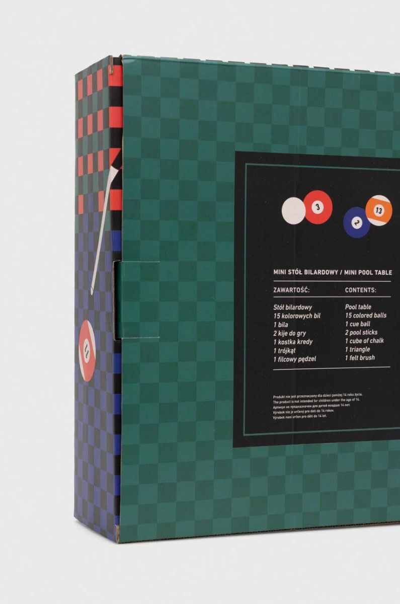 - Предмети в коробці: більярдний стіл, 15 кольорових куль, 1 біла куля, 2 кия, 1 кубик крейди, 1 трикутник і 1 фетровий пензлик.