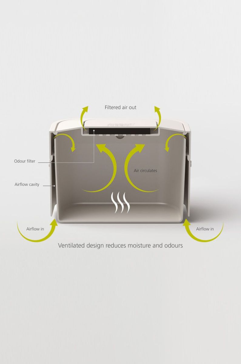 - Оснащено фільтром, що поглинає запахи, і системою, яка забезпечує циркуляцію повітря всередині, але в той же час запобігає виходу запахів назовні.