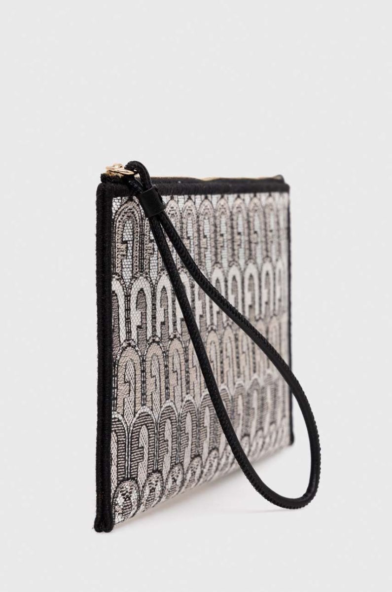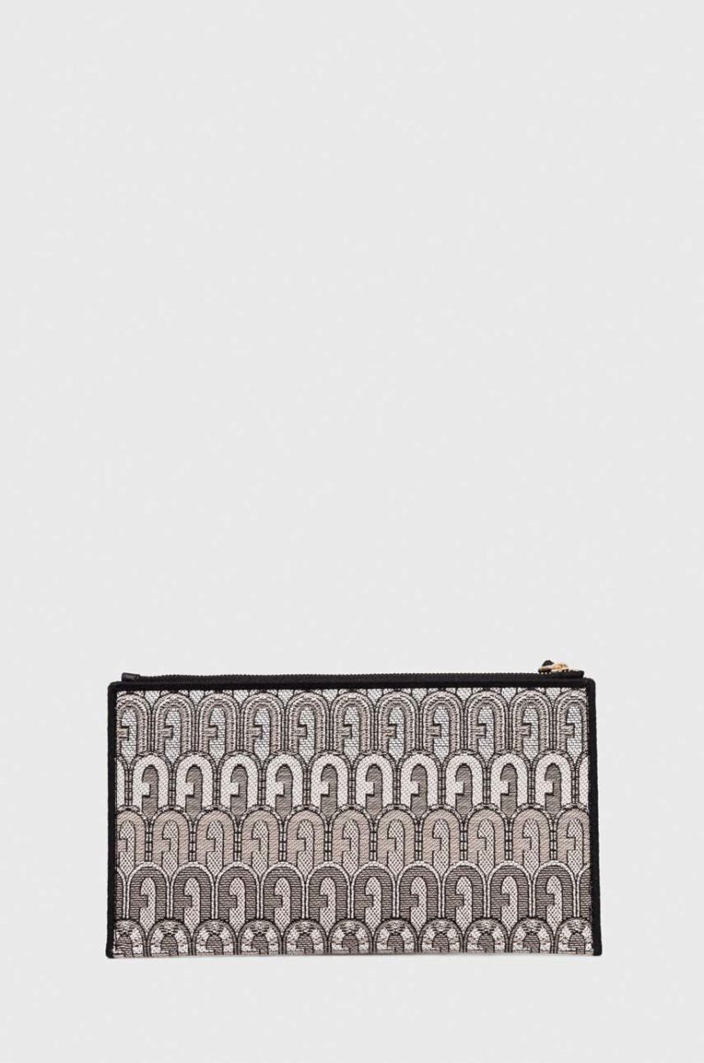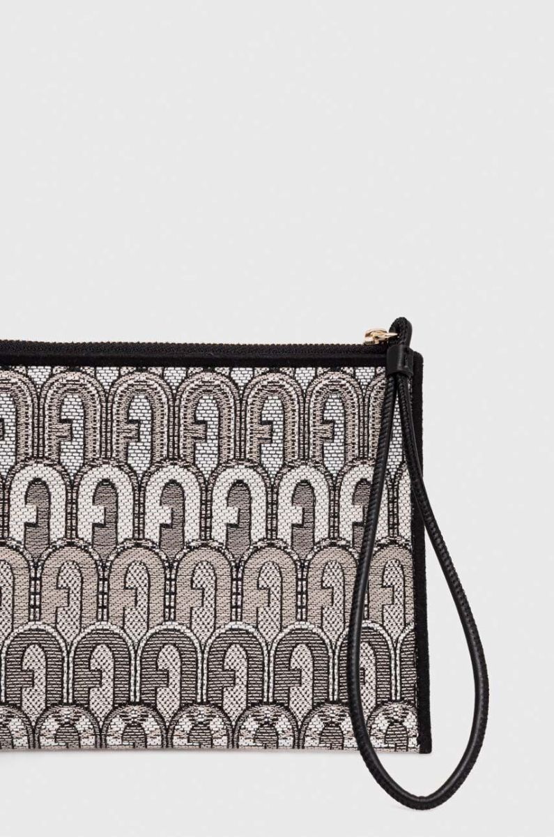 Маленька сумка-клатч із колекції Furla. Застібна модель виготовлена із поєднання текстильного матеріалу і натуральної шкіри.
