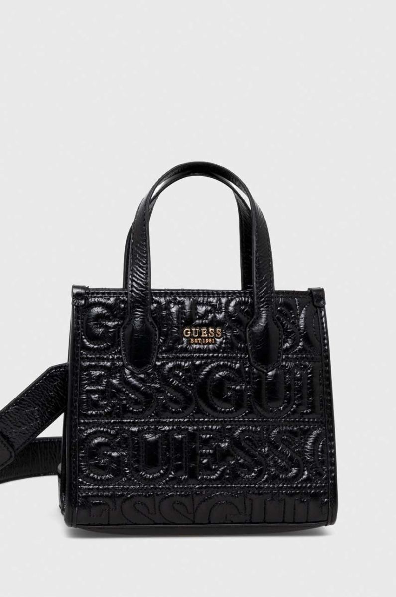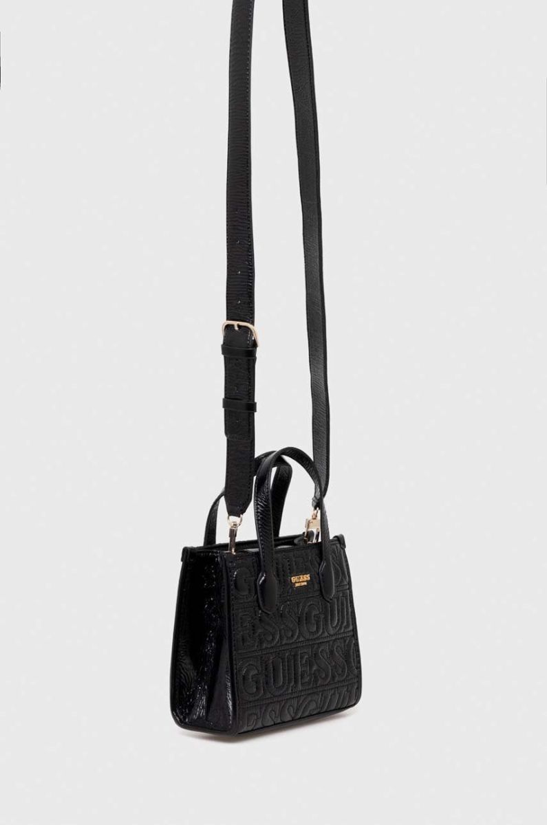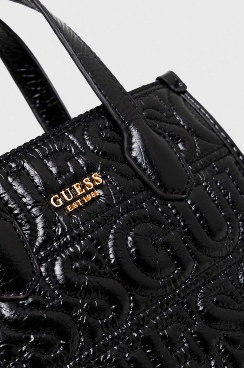 Середнього розміру сумка-клатч із колекції Guess. Застібна модель виготовлена із текстильного матеріалу.