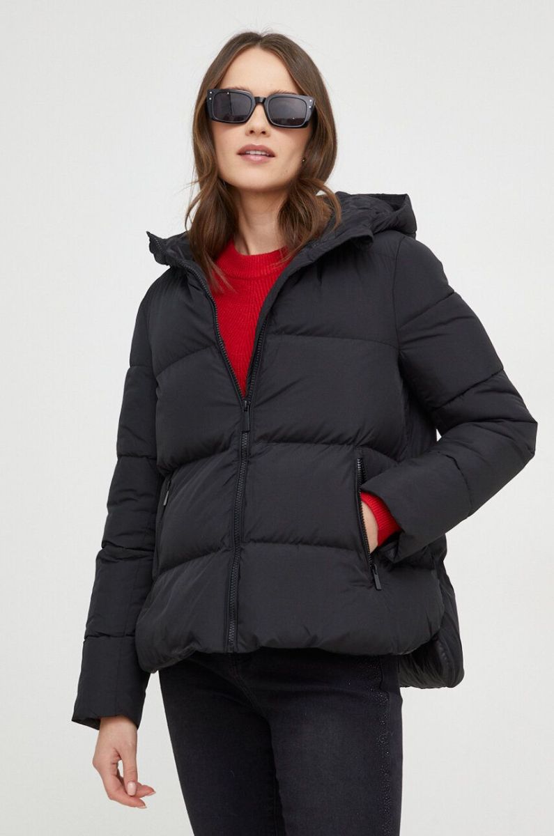 - Завищений комір і незнімний капюшон забезпечують додатковий захист від холоду.