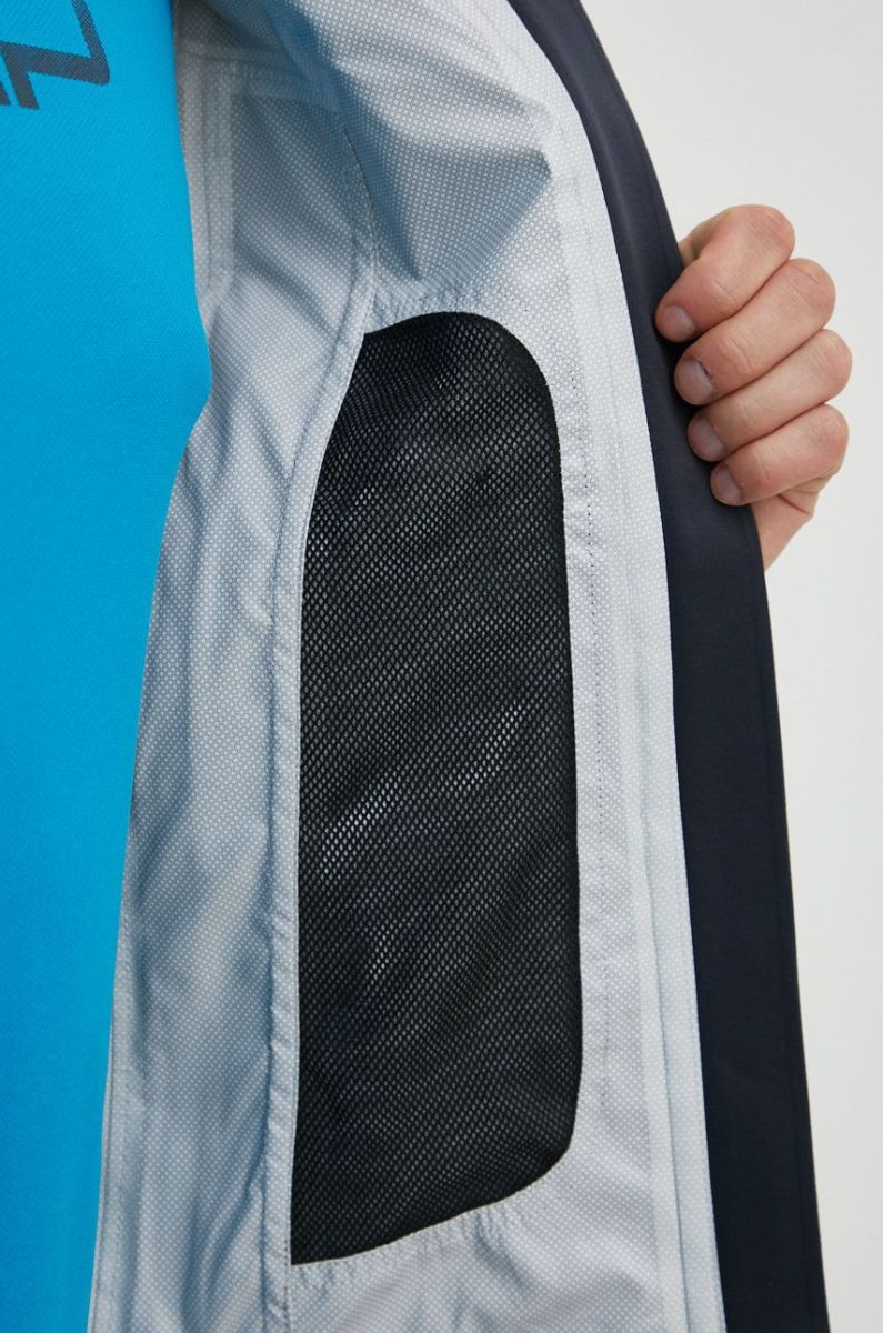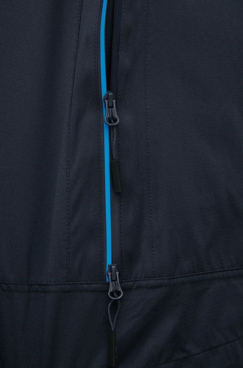 - Високий комір, що закриває підборіддя, та капюшон, який регулюється зав’язками, забезпечують захист від холоду, вітру, снігу та дощу.