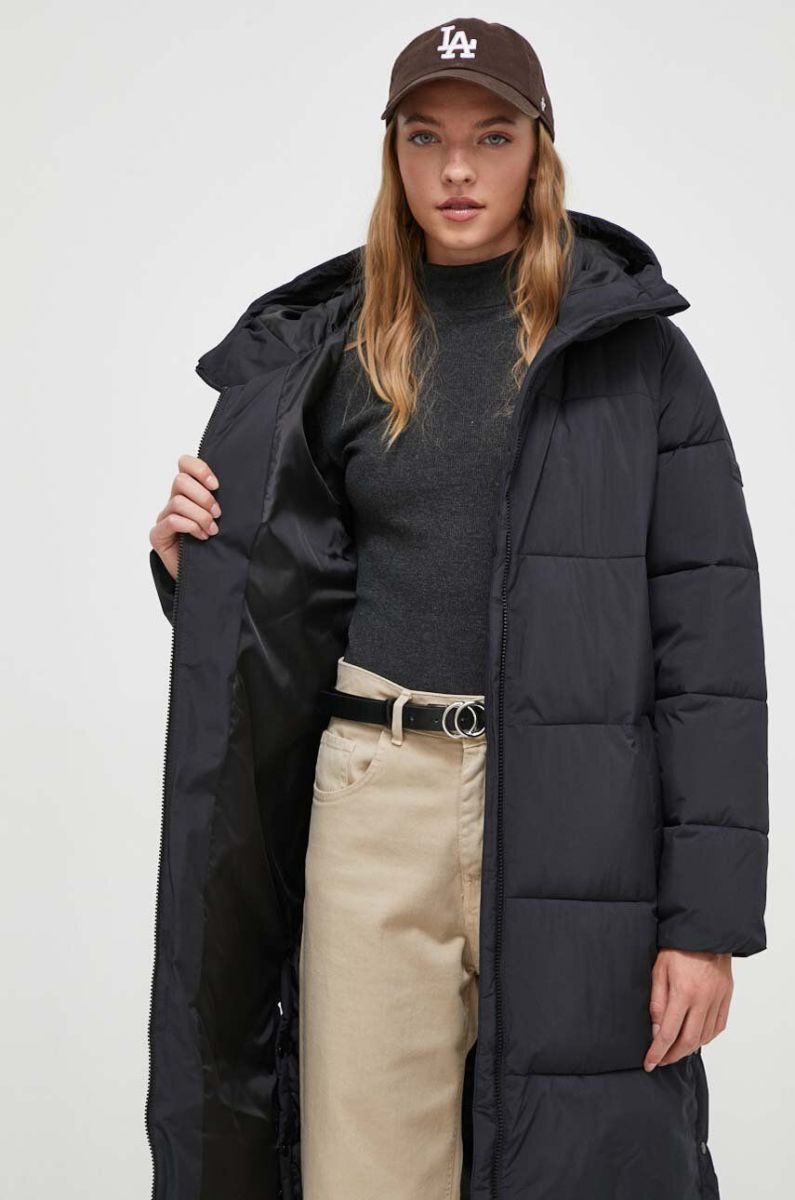 - Завищений комір і незнімний капюшон забезпечують додатковий захист від холоду.