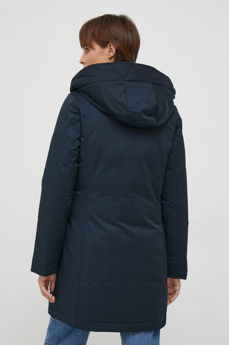 - Завищений комір і незнімний капюшон забезпечують додатковий захист від холоду.