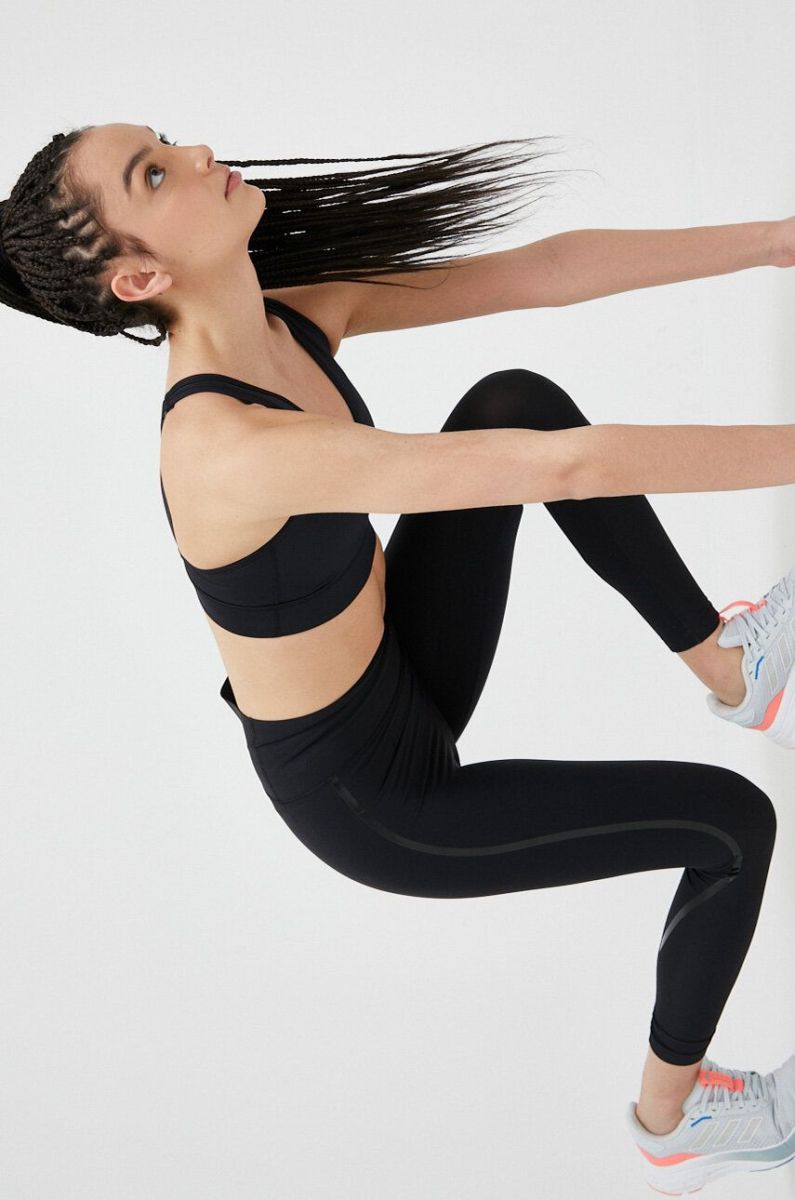 - Верхній край оброблений широким поясом, який формує фігуру та забезпечує додаткову підтримку під час занять.