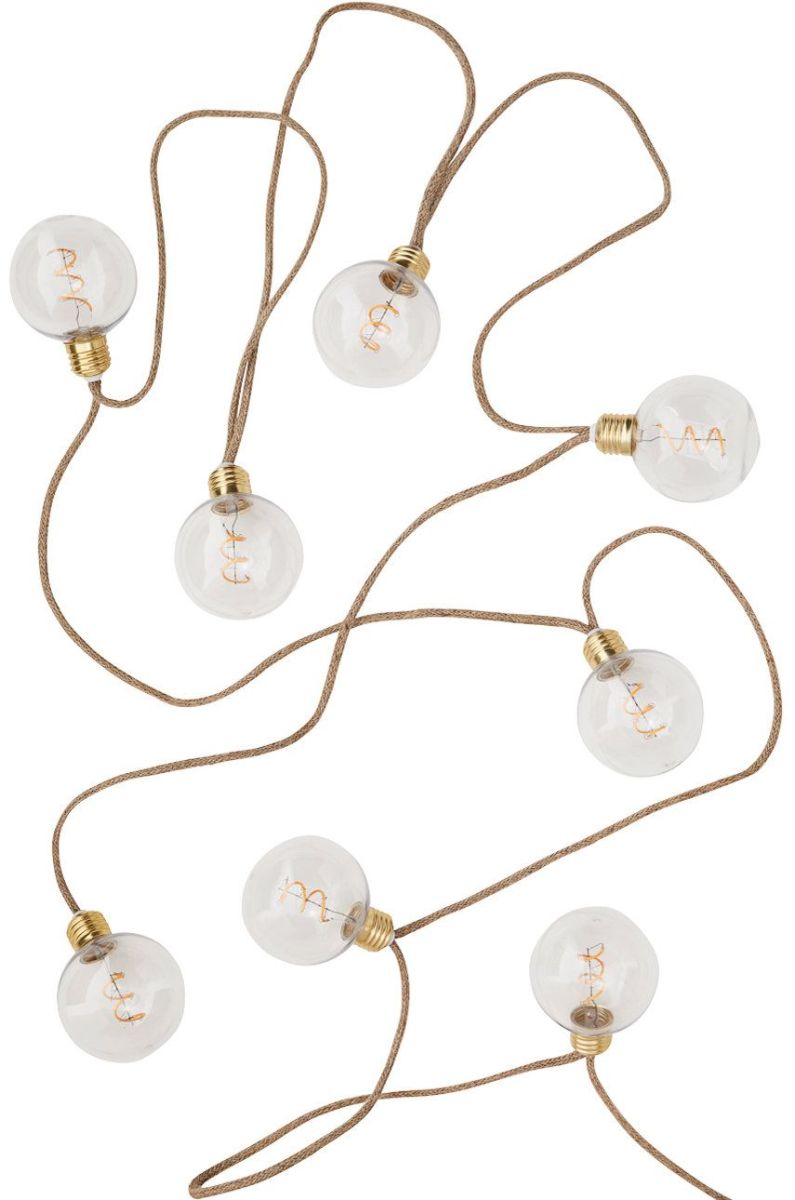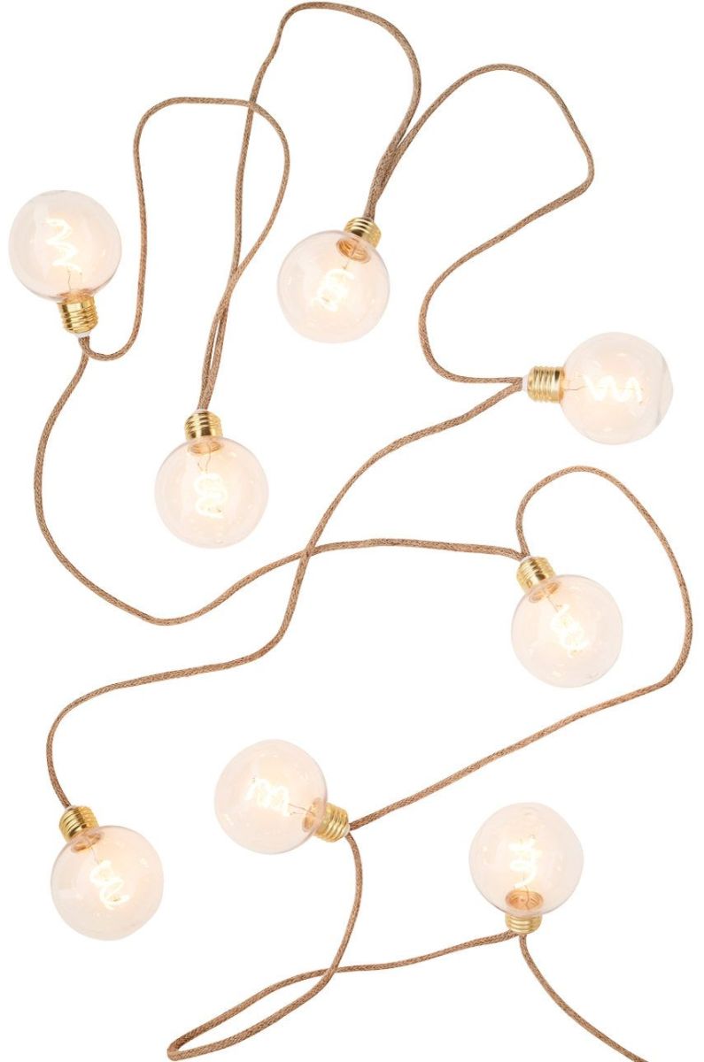 - Світловий ланцюг з 8 лампочок на джутовому шнурі. Кожна з лампочок має видиму нитку розжарювання в декоративній формі.