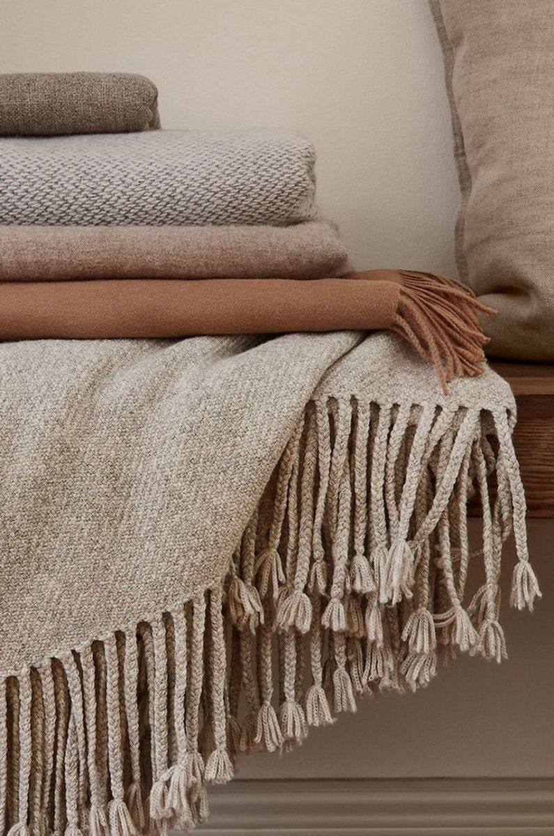 - Ковдра м'яка і еластична, сплетена вручну, оброблена довгою бахромою.