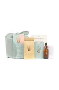 - У комплекті: пов'язка на голову, суміш пелюсток квітів для створення настою, олійка для обличчя (145 мл), масажер Jade Gua Shai та покрокова інструкція з проведення ідеального цифрового детокс-ритуалу.
