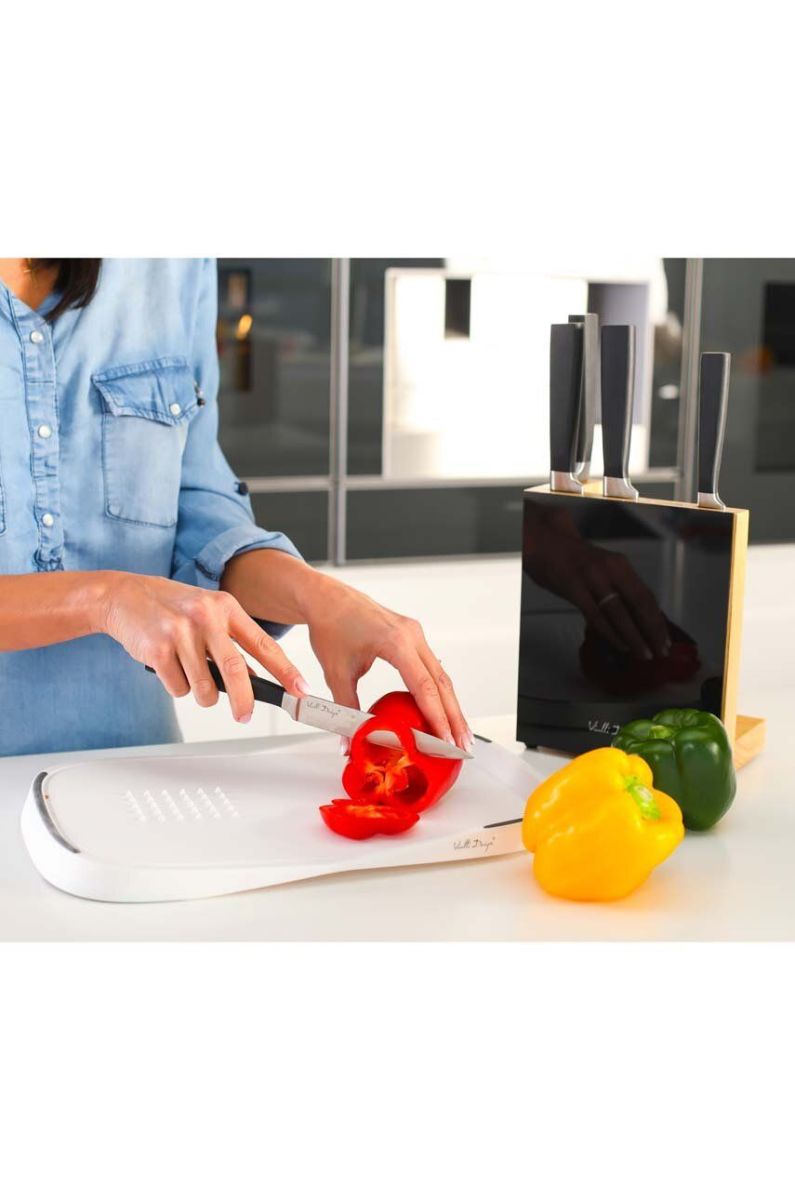 - Вміщує 5 ножів (кухарський ніж - 20 см, ніж для хліба - 20 см, ніж для м'яса - 20 см, ніж універсальний - 12,5 см і ніж для чищення - 9 см).