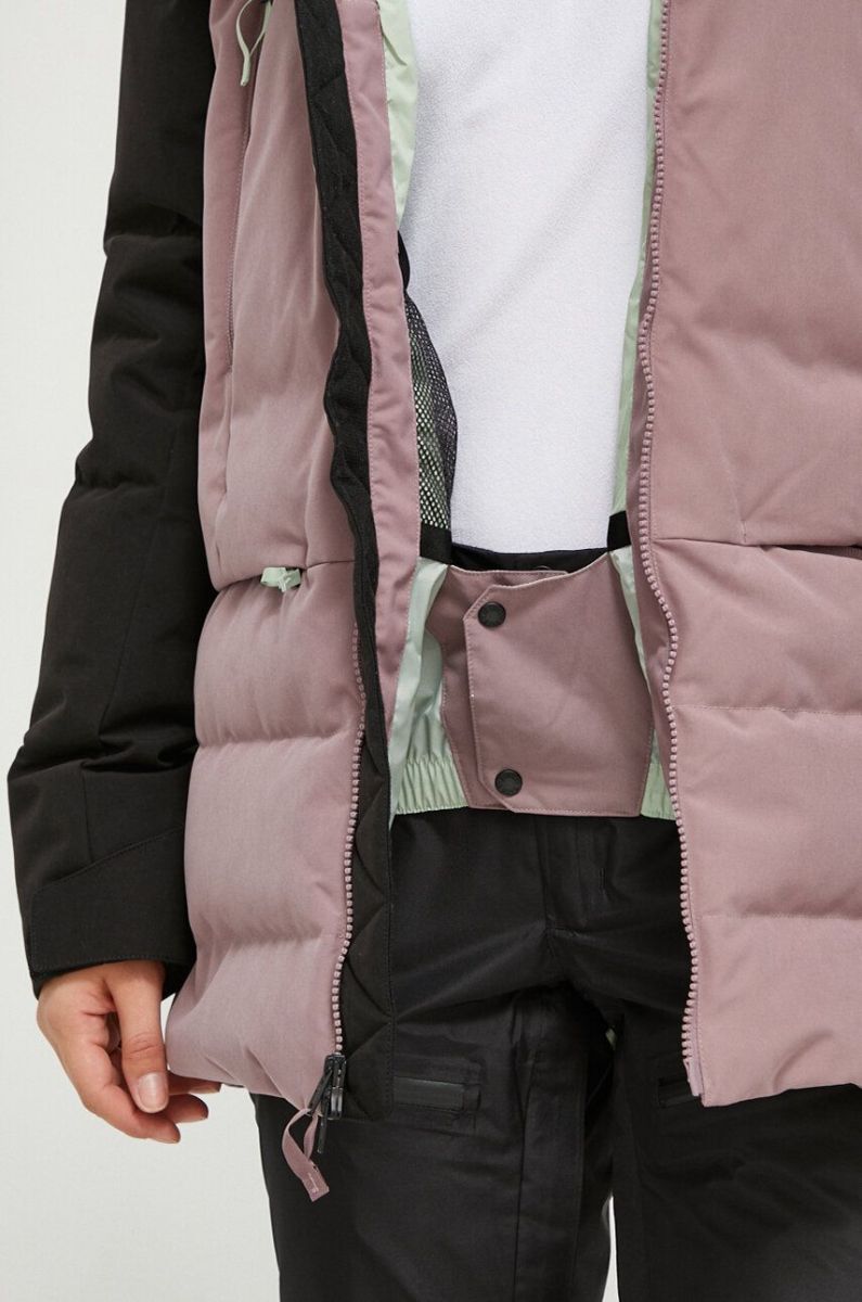 - Високий комір, що закриває підборіддя, та капюшон, який регулюється зав’язками, забезпечують захист від холоду, вітру, снігу та дощу.