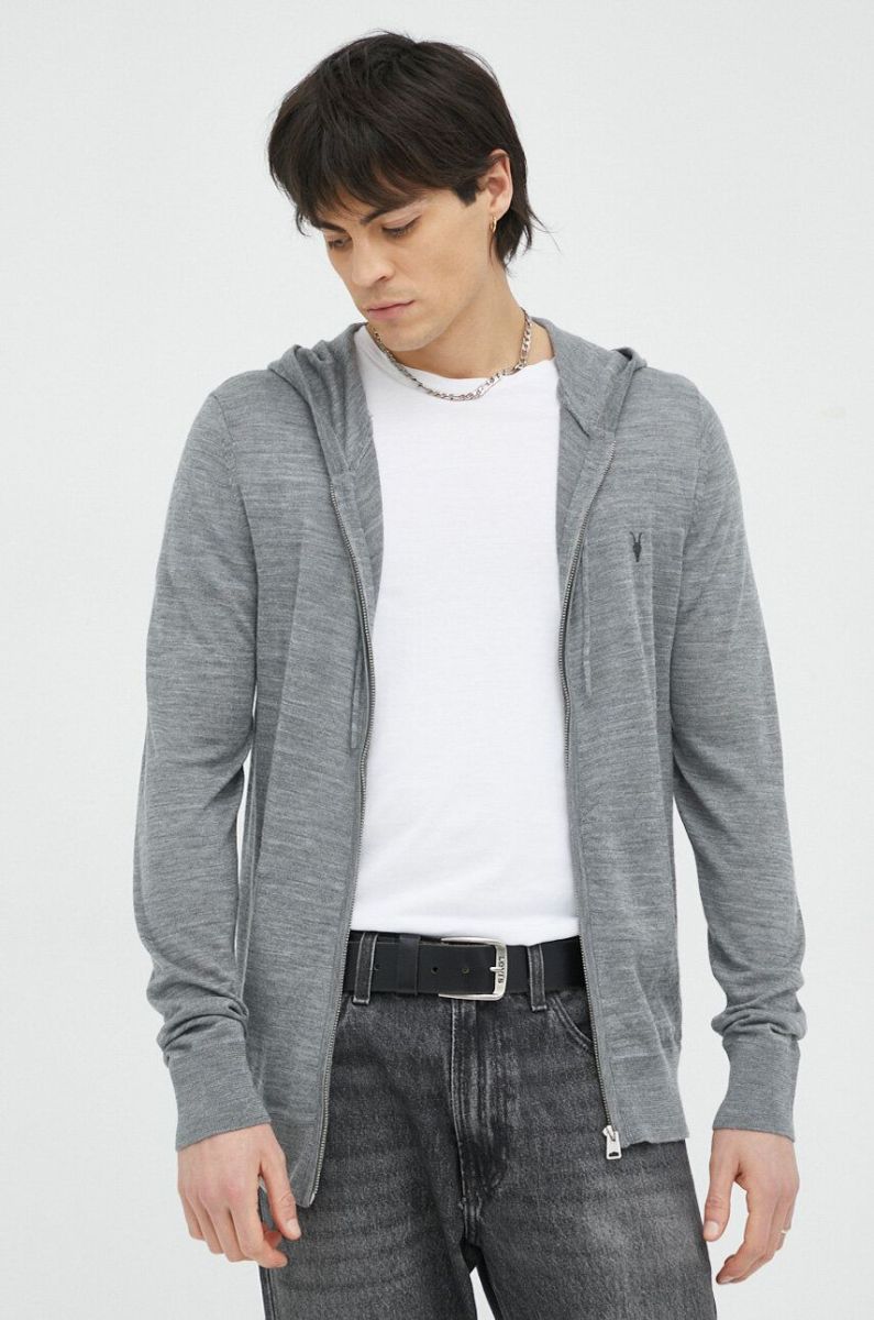 Шерстяна кофта AllSaints колір сірий з капюшоном меланж