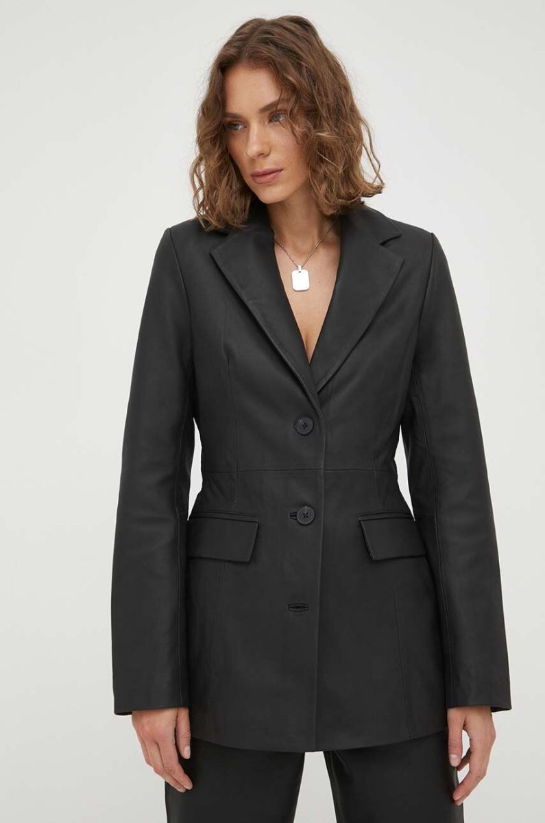 Шкіряний піджак Remain колір чорний однобортний однотонна