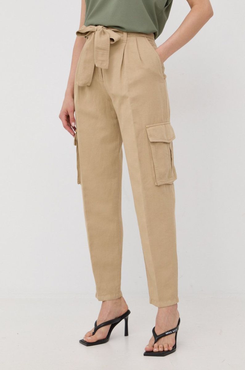 Штани з домішкою льону HUGO жіночі колір бежевий фасон cargo висока посадка