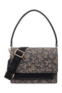 Середнього розміру сумочка з колекції Tous. Застібна модель виготовлена із поєднання текстильної тканини і штучної шкіри.