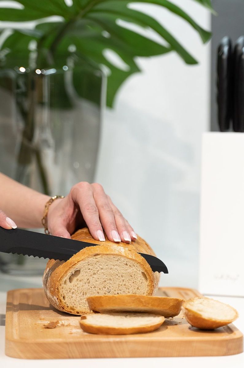 - Вміщує 5 ножів (кухарський ніж - 20 см, ніж для хліба - 20 см, ніж для м'яса - 20 см, ніж універсальний - 12,5 см і ніж для чищення - 9 см).