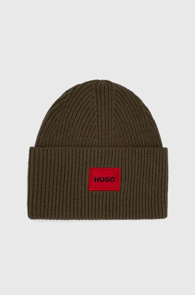 Вовняна шапка HUGO колір зелений з товстого трикотажу вовна