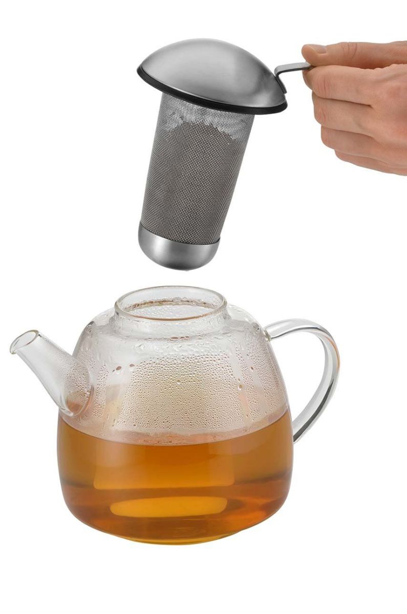 - У комплекті: скляний чайник, сталеве ситечко і кришка з пластиковою ручкою, сталевий підігрівач для чайних свічок.