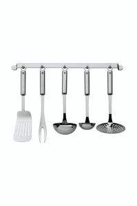 - Набір складається з ополоника, шумівки, ложки для соусу, лопатки, вилки для м'яса та вішалки.